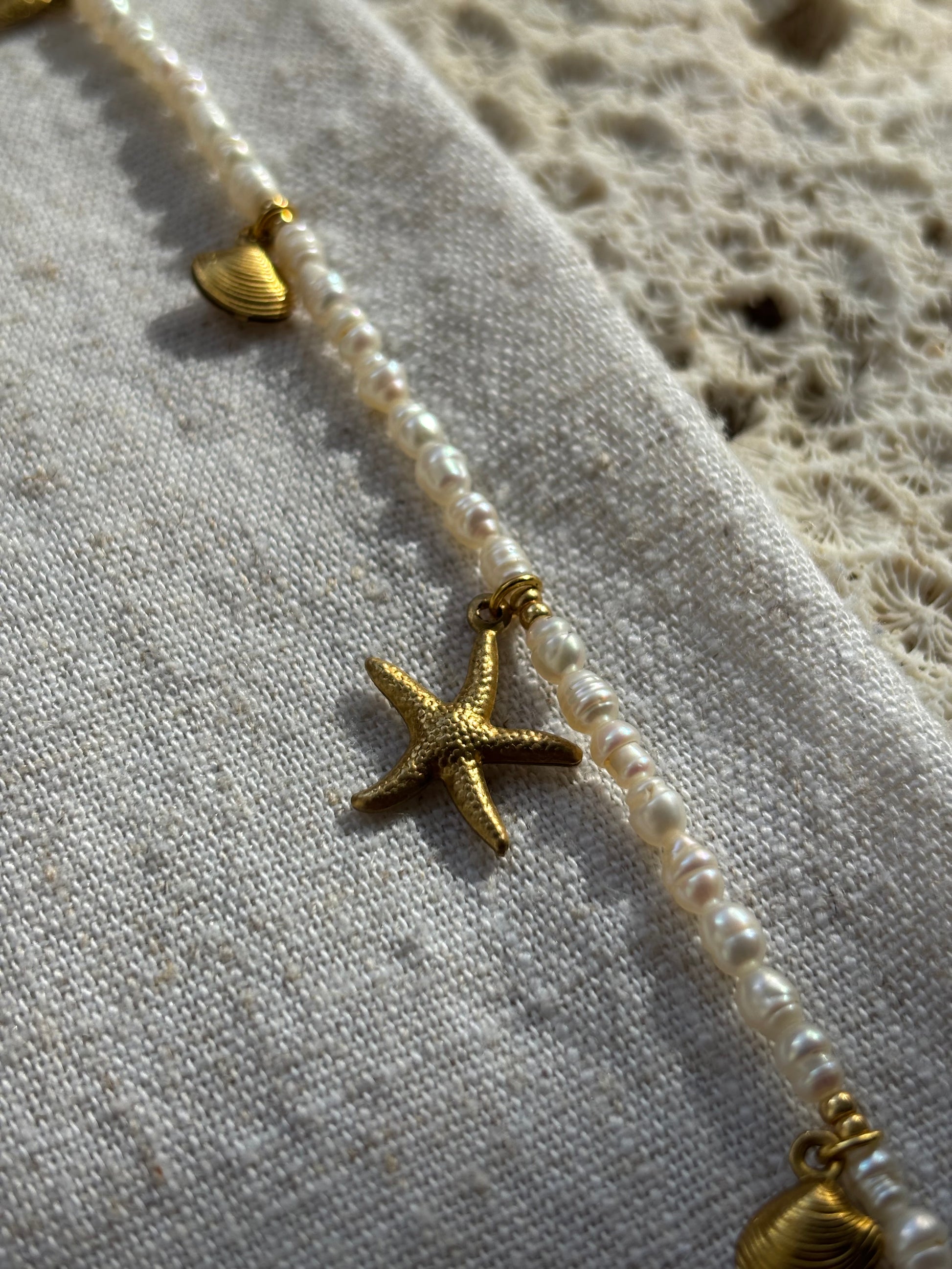 This luminous necklace is crafted with genuine freshwater pearls, carefully hand-selected and adorned with gold starfish and seashell charms.